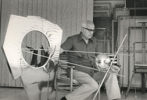 Εικόνα: Cor-ten, 1966, κράμα μετάλλου cor-ten, ύψος 17,75 μ., πλατεία Συντριβανιού, Διεθνής Έκθεση, Θεσσαλονίκη - Εικόνα 2: Ο Γιώργος Ζογγολόπουλος στην κατοικία του στο Ψυχικό, με το γλυπτό του Κενό και σφαίρα - [δικαιώματα χρήσης της φωτογραφίας: Ίδρυμα Ζογγολόπουλου]